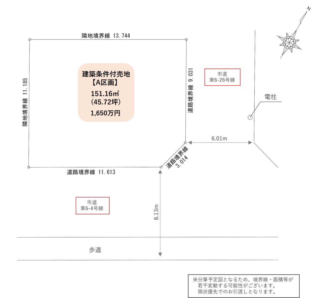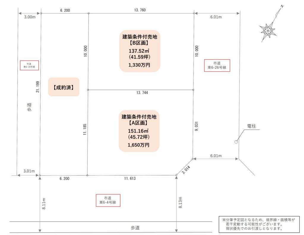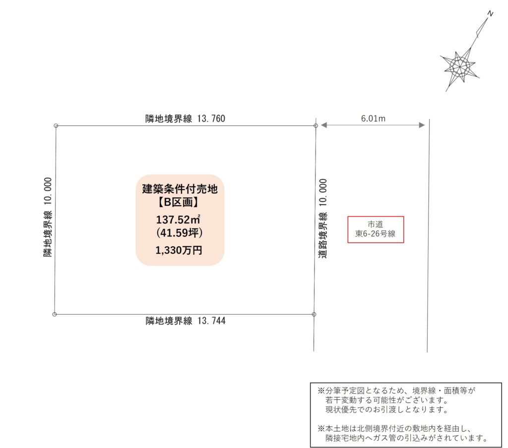 | 備考 | ★建蔽率:区画 A → 70% 区画 B → 60% ★現況:更地 ※上⽔道の宅地内引込⼯事は買主負担で別途必要です(⽬安:50万円程) |
